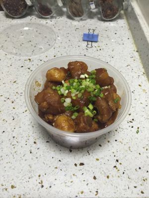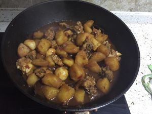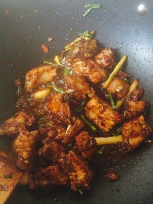 水烧到一半放些料酒,老抽,生抽,翻几下。继续煮直到水烧干。
