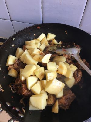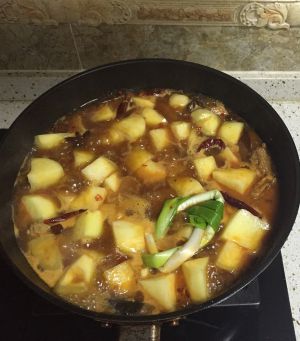 加水烧一会儿 再倒入土豆 大葱节 和适量老抽 盖上锅盖 中火焖烧大概15-20分钟