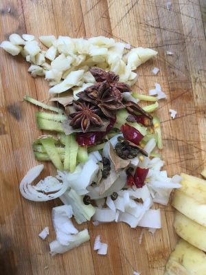 葱姜蒜,花椒八角,辣椒段,香叶,桂皮等香料准备好。
