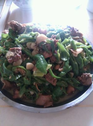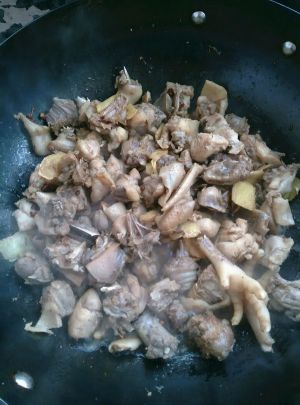 锅里放油适量,放入花椒炸出香味,放入鸡,放入生姜,料酒。最后加入水,把水烧干放入青椒辣,大蒜,大葱就可以了。