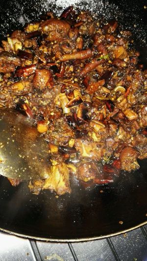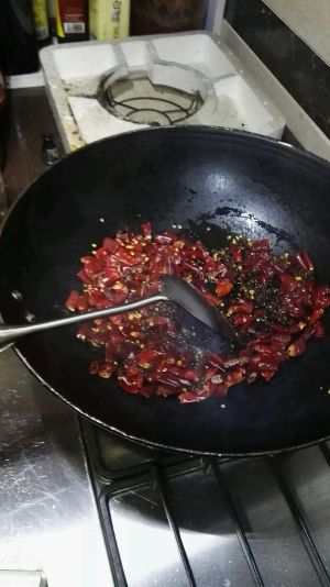 另起油锅,待油热后,把事先准备好的配料倒入锅中翻炒,干辣椒炒的差不多放入老酱。