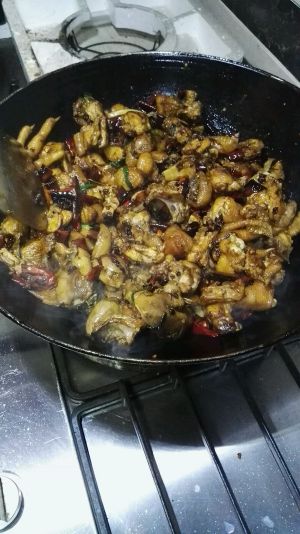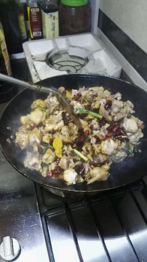 这里的炒制开始,操作一气呵成,没有时间一一拍照了,首先放油,不要太多用炸鸡肉剩下的油过滤干净就行,然后放入姜蒜、花椒,豆瓣酱,最后放入干辣椒,炒香后,下入洋葱炒,洋葱断生下入鸡肉翻炒,让辣子味和鸡肉融合,这步考验你的油烟机哦,呛辣椒的滋味了解一下,反正我是打了几个喷嚏的,很呛。最后,放入藕丁,翻炒几下放入芹菜,从锅边淋入啤酒,增香又使鸡肉更嫩