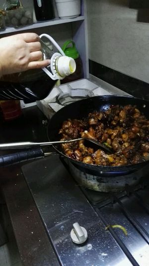炒均匀后放适量盐和酱油,老抽。糖色也很深,不放老抽也可以。