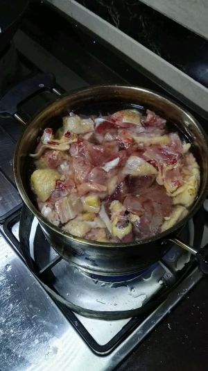 鸡切小块,冷水入锅,加入老姜、料酒,香料,煮开去血水。