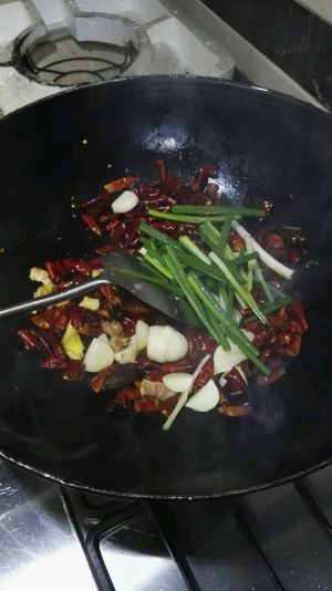 起油锅依次加入姜,蒜,花椒,辣椒煸香。