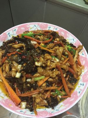 然后放入姜蒜(切碎)豆瓣,白糖,醋,老抽,然后放入胡萝卜,炒一会放入木耳,仔放入葱段!