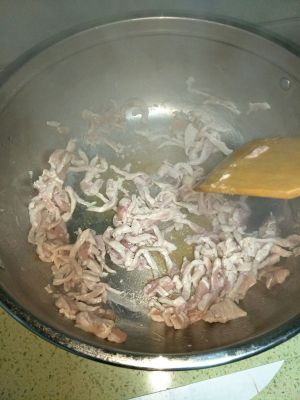 锅里倒入食用油,肉丝倒入锅中,大火翻炒,至肉丝变色,盛出备用