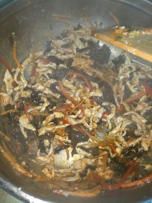 先把肉丝炒熟,再放入木耳胡萝卜 然后再放入辣椒 香菜 翻炒。倒入2号料,炒匀。再倒入1号料。快速翻炒。出锅。