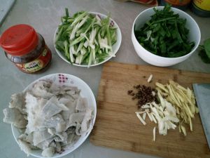 捞出切片,同时切青红椒块,洋葱块,姜蒜片,