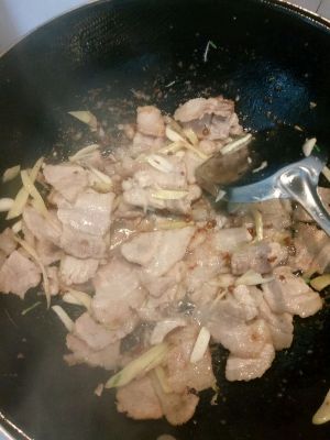 锅里少放点油,倒入五花肉,用大火多吵几下,放入花椒蒜瓣姜丝,转小火,慢慢的炒出香味来,