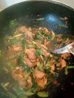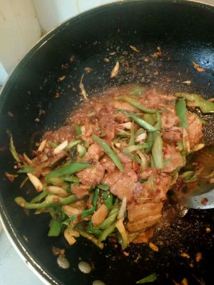先放肉,炒几分钟就放点豆瓣酱、豆鼓、酱油调味调色。等肉炒出油来就可以放蒜苗和青椒了,最后加盐,味精,花椒就可以出锅了。