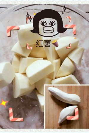红薯切块后,把剩余的10克蒸肉米粉里加入少许生抽拌匀,再把红薯一块块裹上米粉装盘备用