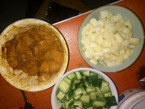 把黄瓜,胡萝卜,青椒切丁,过油备用,