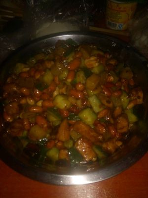 先把鸡丁炒熟,然后把土豆丁炒熟,然后在热油,加入花椒,干辣椒,炒香,加入鸡丁,加入耗油,醋,糖,然后倒入土豆丁黄瓜丁,翻炒均匀,加入花生米,就可以出锅了