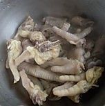 鸡爪洗净,用菜刀切去指甲尖,然后用剁成段,再用清水冲去血水。
