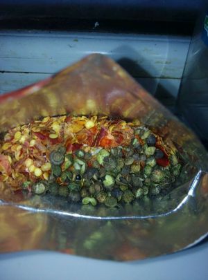麻椒粒孜然粒辣椒面些许,芝麻备用