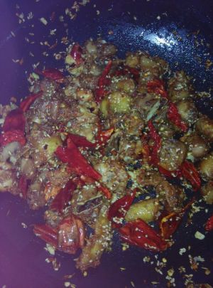 捞出鸡块后改小火依次放入干辣椒,花椒,葱姜蒜炝锅至出香味,然后放入十三香和少许糖