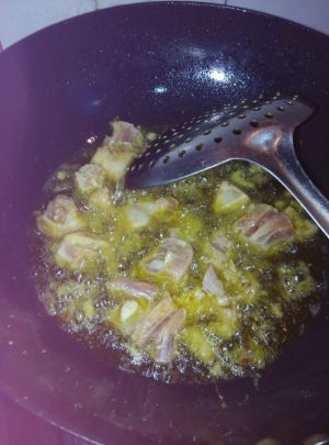 5.油热放下切好的鸡块,炸至金黄,漏勺漏油捞出;