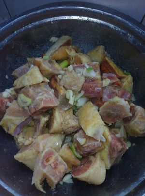 鸡腿剁成块。葱蒜姜切末。盐,花椒面,黑胡椒面。生粉喂鸡肉20分钟左右