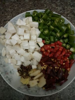 炒香辣椒、花椒、葱姜蒜等;