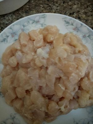 鸡肉切丁,用盐、酒、蛋清把鸡腌半个小时