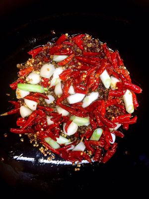 喜欢辣的朋友可以多放辣椒段.辣椒段.麻椒煸炒.出香味.放葱.姜丝.蒜片.鸡丁下锅.调味.