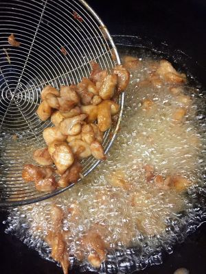 将鸡丁过油炸至金黄色