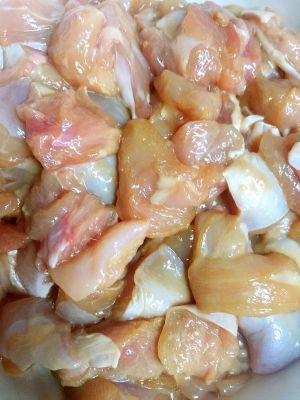 鸡腿切丁.腌制(盐.糖.料酒.鸡精)10钟