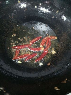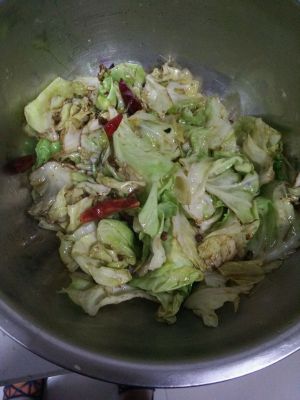 锅中放入花椒和干辣椒炒香,加入包菜,提点盐,炒的不要太老,要脆一些装容器里!
