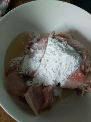 猪里脊洗净后切成薄片,放入生粉,料酒腌十到十五分钟;(为了让肉更加鲜嫩)