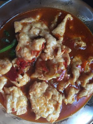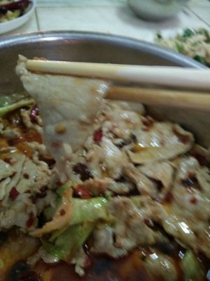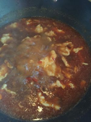 酱包 倒入锅中,加水,煮开,将肉片煮熟,将肉片放倒之前的菜上,把酱汁倒入大碗中(我直接用的水煮肉片料包,淀粉,酱包,辣椒粉都有,也可以用豆瓣酱炒酱汁)