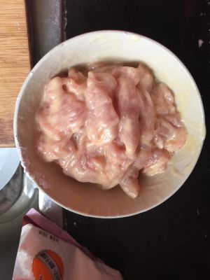 猪里脊肉切薄片,加入化好的水淀粉、鸡蛋、味极鲜、糖、料酒腌渍10分钟左右。