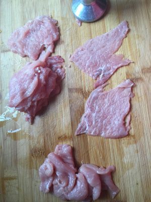 将里脊肉切片,我更喜欢小里脊,肉质更嫩些,不过我没买到就用大里脊凑合了!速冻一个小时,肉很好切!
