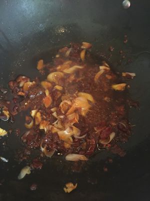 锅中放底油,加入两大勺郫县豆瓣酱,然后放入葱和姜,小火炒香。