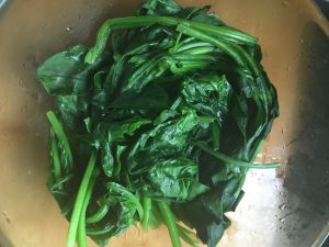 烧开水, 烫菠菜,放到盘底铺好备用。
