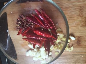 准备辣椒花椒,葱蒜姜切碎。葱蒜分开放。辣椒剪成段。小火在锅中干炒一下辣椒和花椒,盛出。