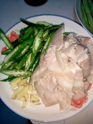 把青椒斜着切,如图。然后肉煮好后也切成片。(我家有吃肥肉的,所以买的肉比较肥。。。个人还是愿意吃瘦点的肉咯。。。奈何啊。。)