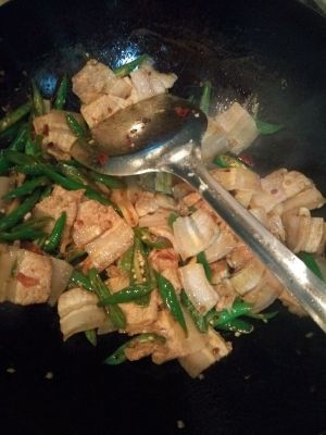 锅里加少量油,等油热以后把老干妈豆鼓放在油锅中暴香,把卤肉辣椒放入锅内翻炒,待辣椒熟后放入蒜苗继续翻炒几下就可以出锅啦!很简单的。老公爱吃~~~