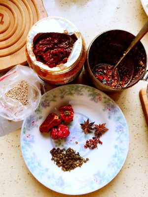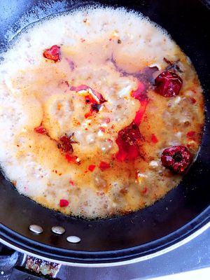 花椒,大料,葱姜蒜爆香,豆瓣酱下锅翻炒片刻放红辣椒