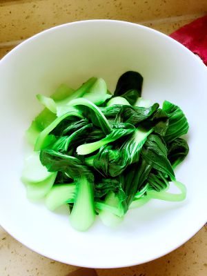 炒锅烧热,加少许油,把青菜清炒一下,加一点盐,起锅装入盛器里。(有的是直接清水煮,我觉得炒的更入味一些)