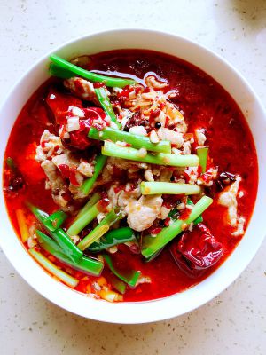 油烧热下姜蒜炒香,再下郫县豆瓣炒香,最后下朝天椒。炒香后加适量清水。煮开后下肉片,煮2分钟后起锅装盘