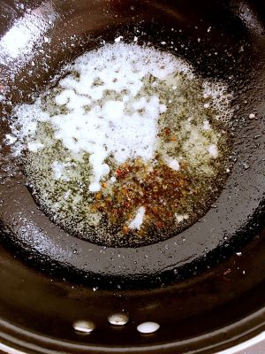 净锅热油,起烟后浇到辣椒碎上,我还加了蒜末、葱花。