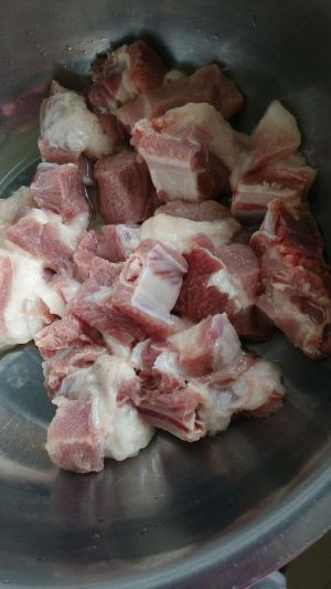 五花肉切块,焯过血水。这肉真心肥。。。买的不好