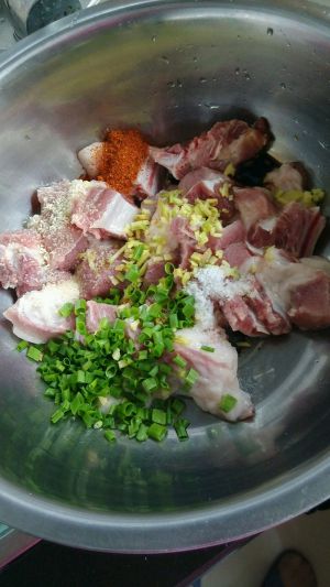 腌好的肉放入一个大一些的容器内,倒入500g面粉(面粉分三次倒进肉里)抓揉均匀,让每块肉都包裹上面粉。
