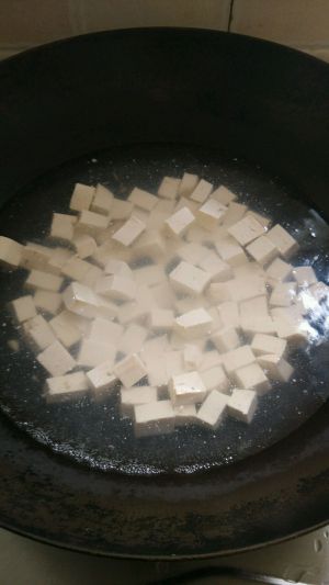 烧水加少许盐。豆腐焯水。一分钟左右。捞起来装好