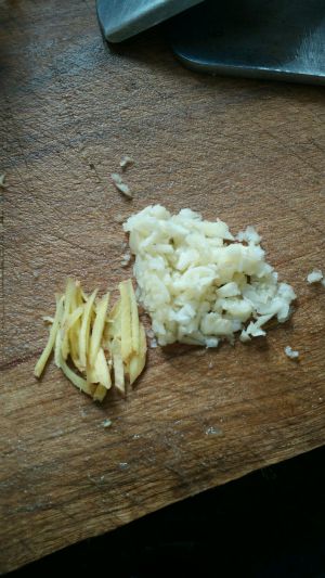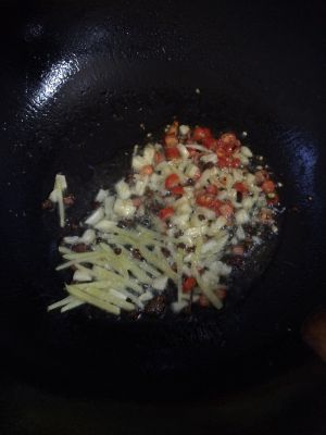 锅里烧油,放花椒粒,生姜丝,大蒜末,指天椒,爆香,