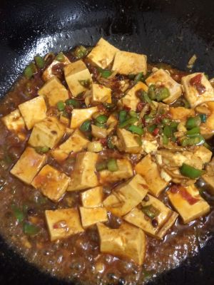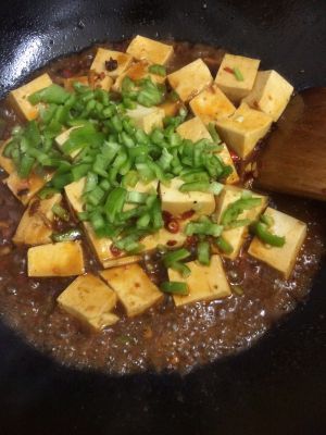 水开成酱汁后放入肉泥,迅速炒散,放入食盐。再把豆腐倒入让每块裹上酱汁。出锅加点葱花。