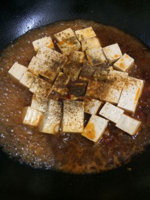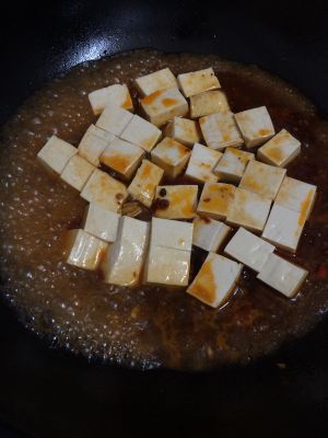 豆腐切块儿,油烧热后放入豆豉,豆瓣酱,倒入豆腐炒匀后加入水没过豆腐。