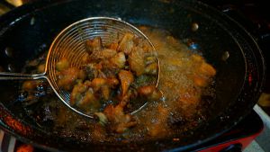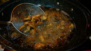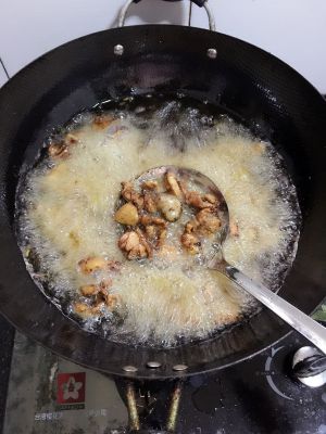 锅里倒入油烧热,下去鸡肉炸至金黄色,捞出备用