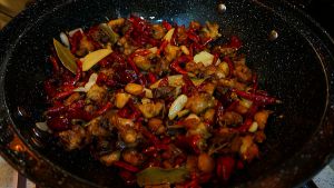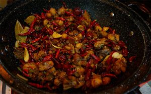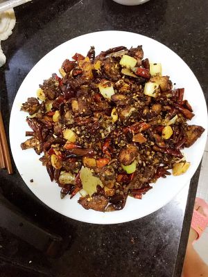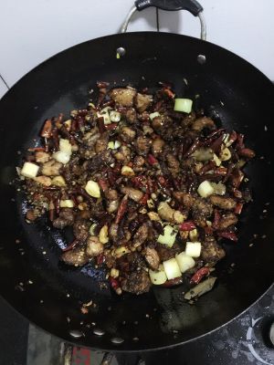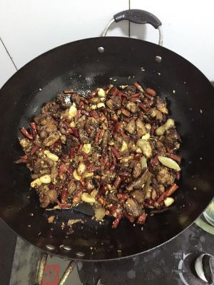 油烧开,放入干红辣椒,麻椒,爆炒出香味,放入鸡腿肉爆炒,,炒一会放入酱油,耗油,盐,再炒。(鸡肉很乐意熟,我比较喜欢火大点的,所以炒的比较久一些)
